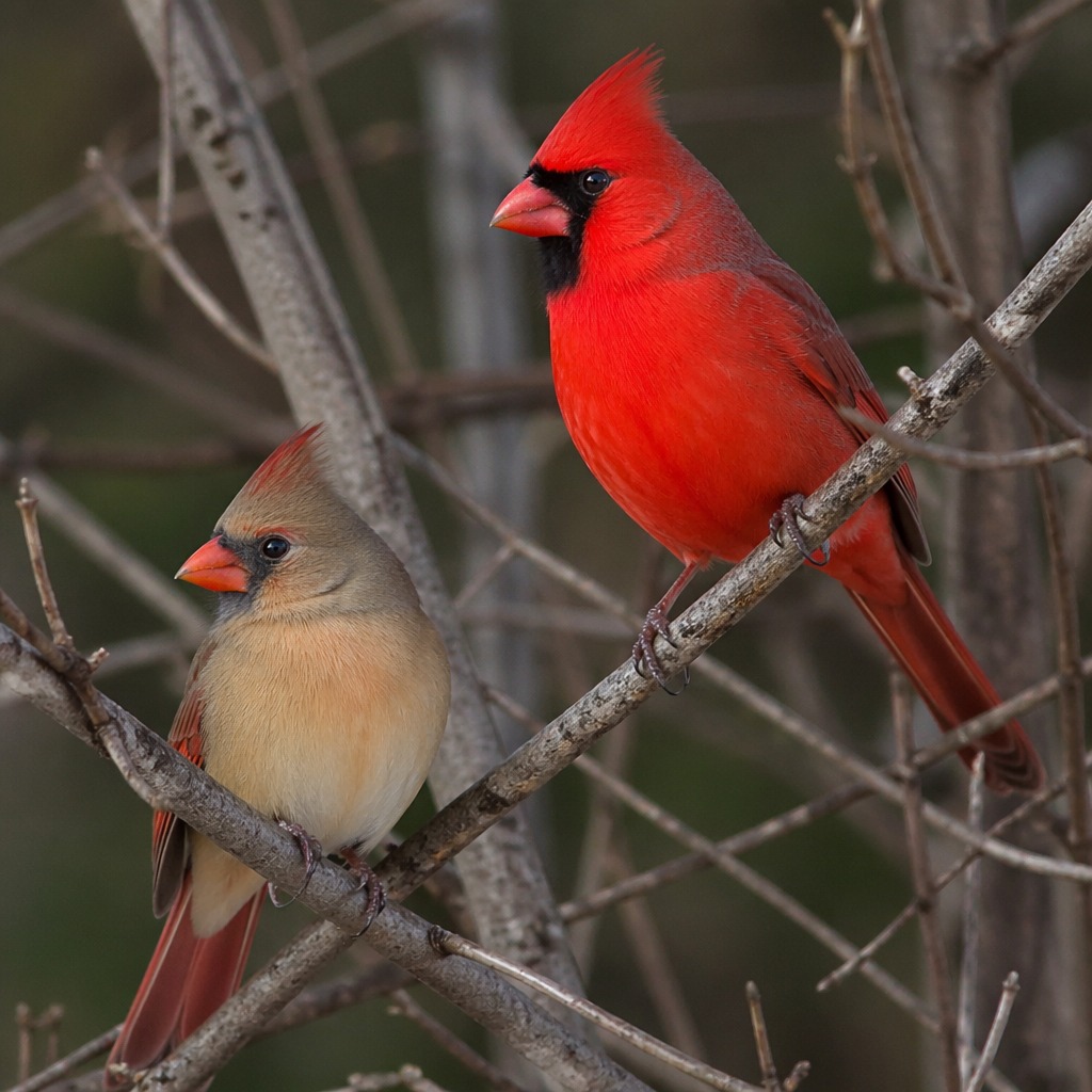 - Plumage Details: Males are brilliant red with a black mask and thick red bill. Females are pale brown with reddish tinges in the wings, tail, and crest.